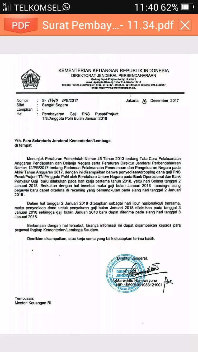 Surat ini tertanggal 19 Desember 2017 dengan Nomor S- /1310 /PB/2017, ditandatanganin oleh Direktur Jenderal Perbendaharaan, Marwanto Harjowiryono, ditujukan pada para Sekretaris Jenderal atau lembaga negara di Jakarta.