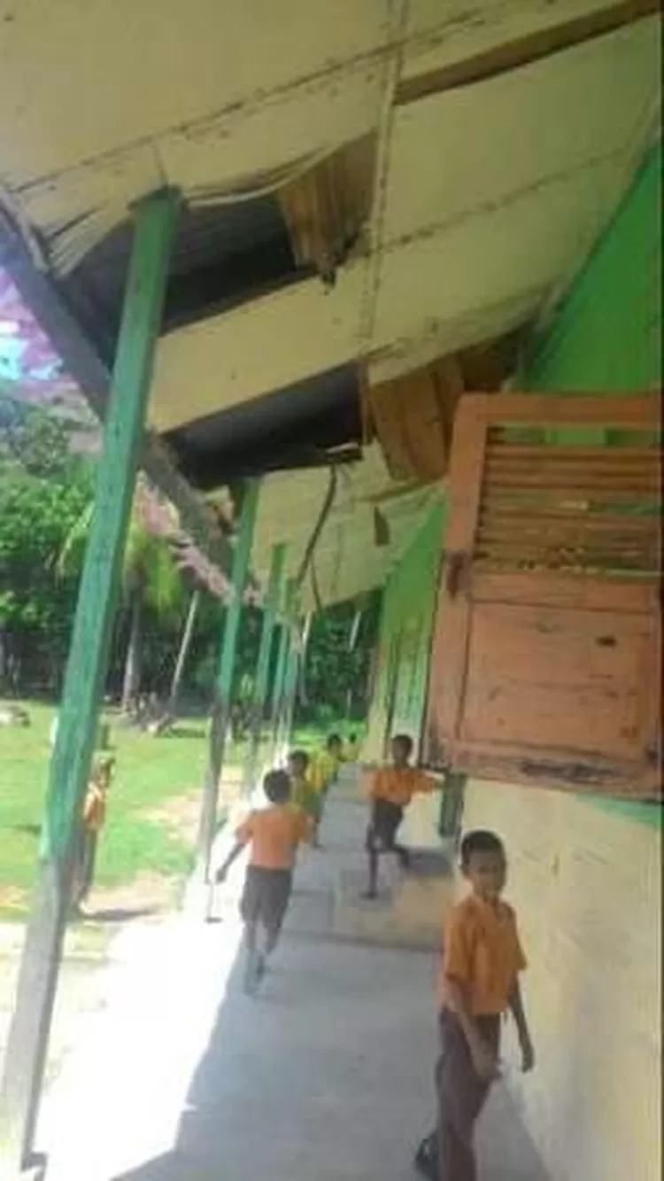 “Seperti inilah, Pak, sekolah kami, masih terbuat dari kayu. Semenjak berdiri sekolah ini tahun 1971, baru pertama direnovasi tahun 2000 silam. Itu pun dindingnya masih kayu, setelah itu belum pernah direnovasi, Pak,” kata Roibi.