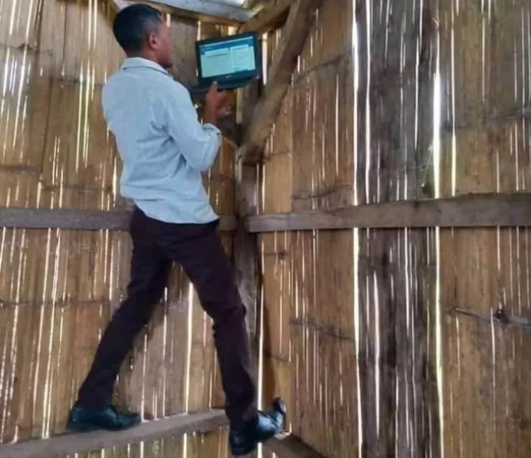 Terlihat juga seorang guru sampai naik ke atas dinding yang terbuat dari anyaman bambu seraya membawa laptop guna mendapatkan sinyal yang bagus.
