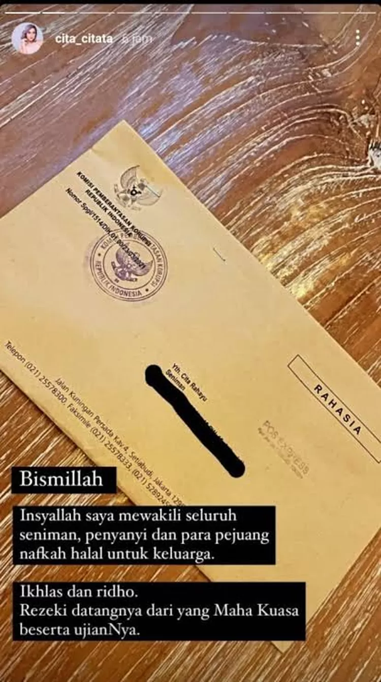 "Bismillah. Insyaallah saya mewakili seluruh seniman, penyanyi, dan para pejuang nafkah halal untuk keluarga," tulis Cita Citata dalam postingannya itu, Jumat (26-3).