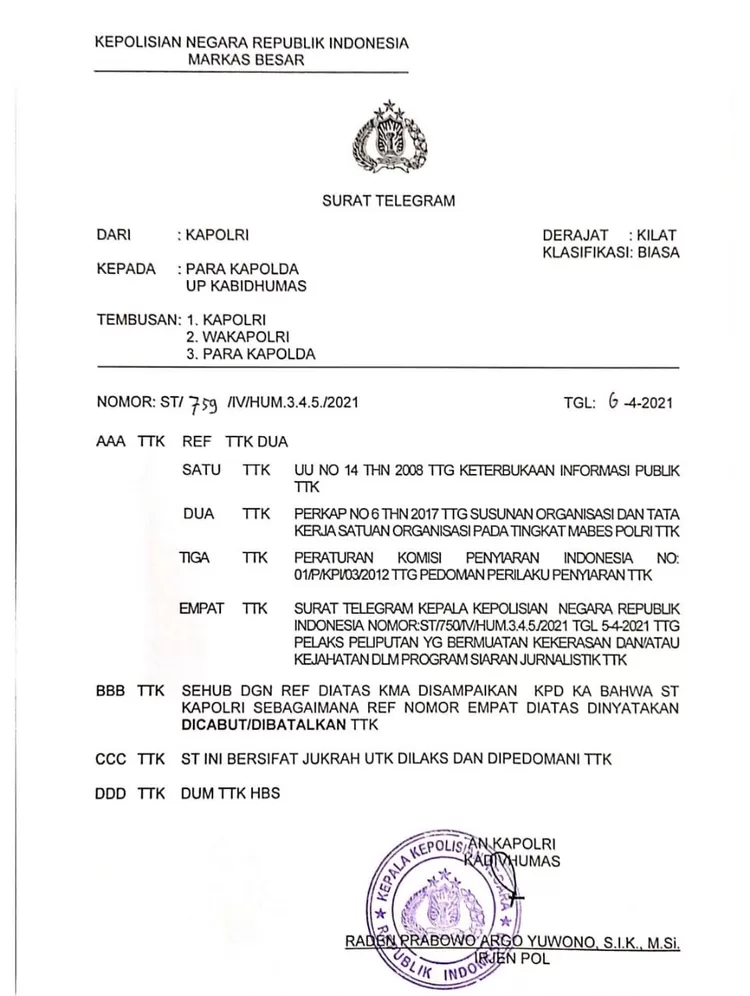 Pencabutan ini termuat dalam Surat Telegram Nomor: ST/759/IV/HUM.3.4.5./2021. Surat tersebut dikeluarkan pada hari ini, Selasa, 6 April 2021, dan ditandatangani Kadiv Humas Polri Irjen Raden Prabowo Argo Yuwono.